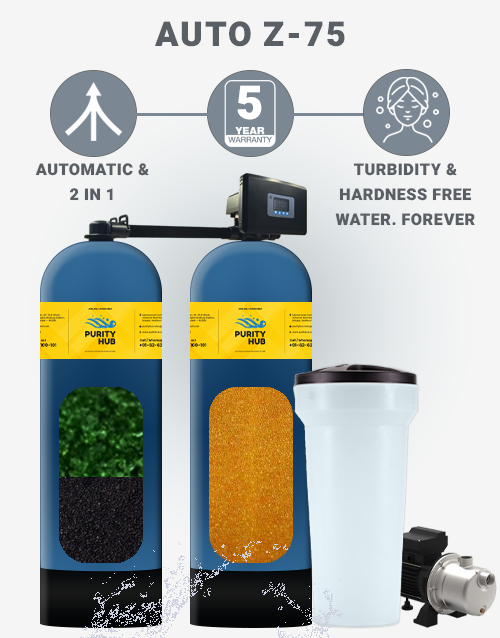 The Purity Hub Auto Z-75 is a fully automatic, intelligently engineered hybrid water softener that combines advanced softening technology with 5-micron precision filtration using special glass media—offering superior clarity and protection from fine particles. Unlike conventional setups that require two separate multiport valves, the Auto Z-75 uses a single, specially designed multiport valve to manage both filtration and softening functions, significantly reducing plumbing complexity, cost, and water wastage during regeneration. The valve is built with high-strength ceramic discs, fired at extreme temperatures (1680°C to 2200°C), ensuring long-term durability and corrosion resistance. The system comes preloaded with 15% cross-linked ion exchange resin for enhanced hardness removal and is equipped with weatherproof wiring, push-fit brine connectors for tool-free installation, and smart automation features. These include Purity Hub’s patented Low Salt Alarm, a real-time Smart Info Panel, the LP-BFT safety system to prevent dry regeneration, and a dual-function pump interface that allows the regeneration motor to double as a pressure pump. Compact, eco-efficient, and reliable, the Auto Z-75 is a next-generation solution for homes and communities seeking high-performance water purification in a single intelligent unit.